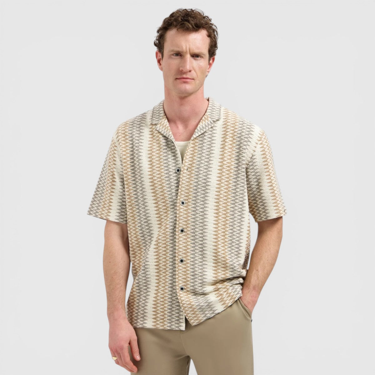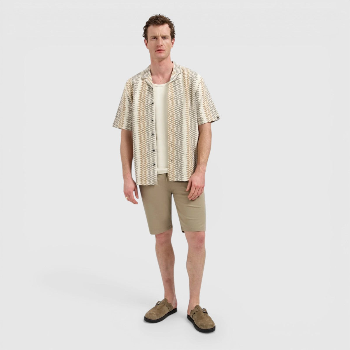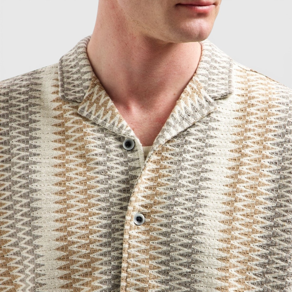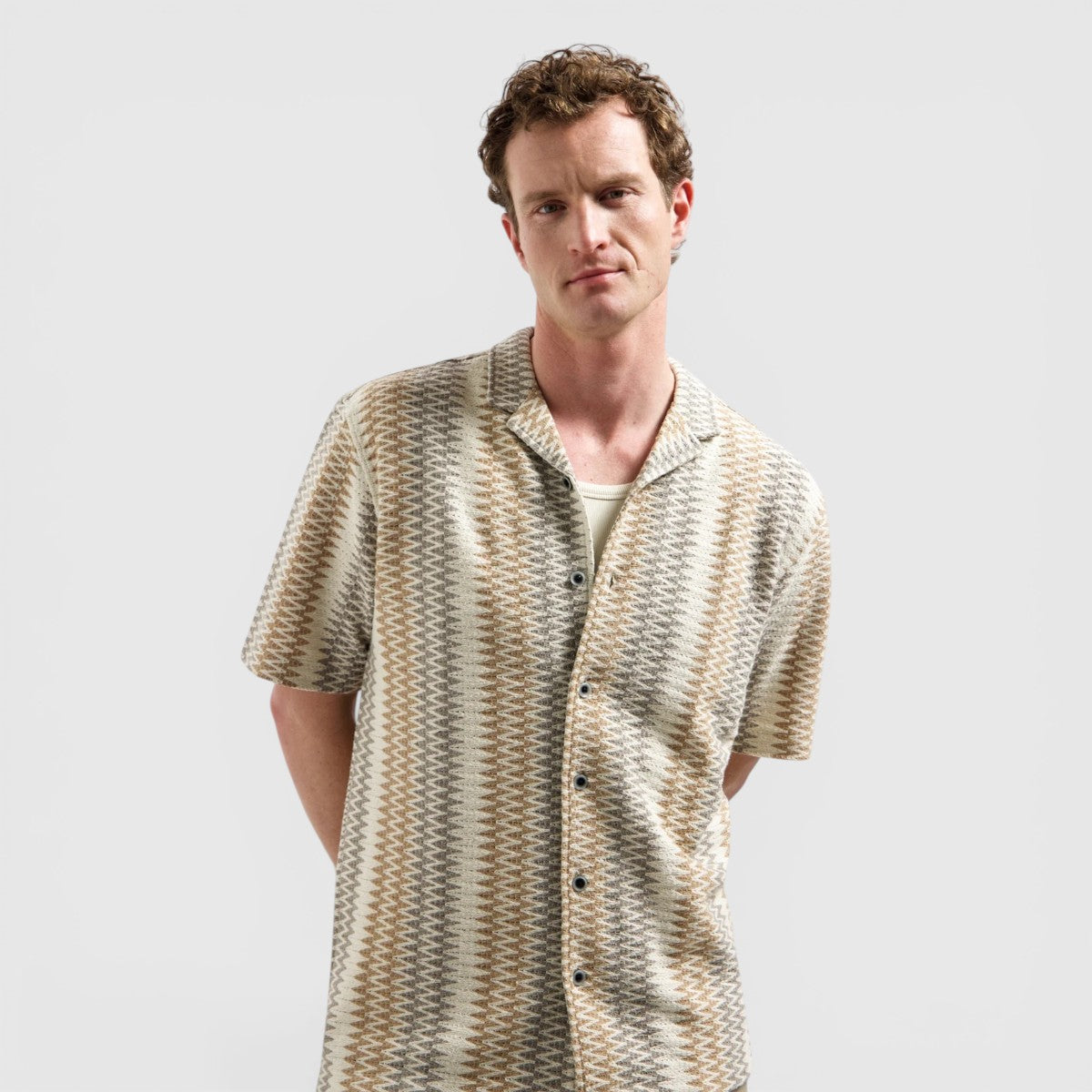 Het No Excess Overhemd Korte Mouw Jacquard heeft een opvallende, zomerse uitstraling dankzij het verticale ingeweven patroon dat over het hele overhemd doorloopt. De stof oogt rijk van structuur en laat een duidelijk golvend zigzagmotief zien, wat het geheel extra diepte en karakter geeft. De open campkraag zorgt voor een relaxte, moderne look, terwijl de volledige knoopsluiting met contrasterende knopen het overhemd een verzorgde afwerking geeft. Door de comfortabele, iets ruimere pasvorm valt het mooi los langs het lichaam – perfect voor een stijlvolle, ontspannen zomeroutfit.